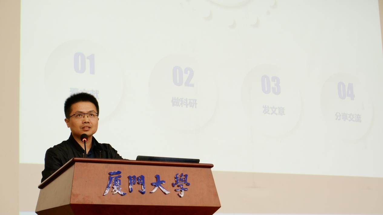 分享会环节中,林元国同学详尽地为同学们介绍了看文献、做科研、发文章三个方面的技巧方法,他强调研究生要有危机感,要严格要求自己,希望大家能够培养兴趣、做一个快乐的科研人。