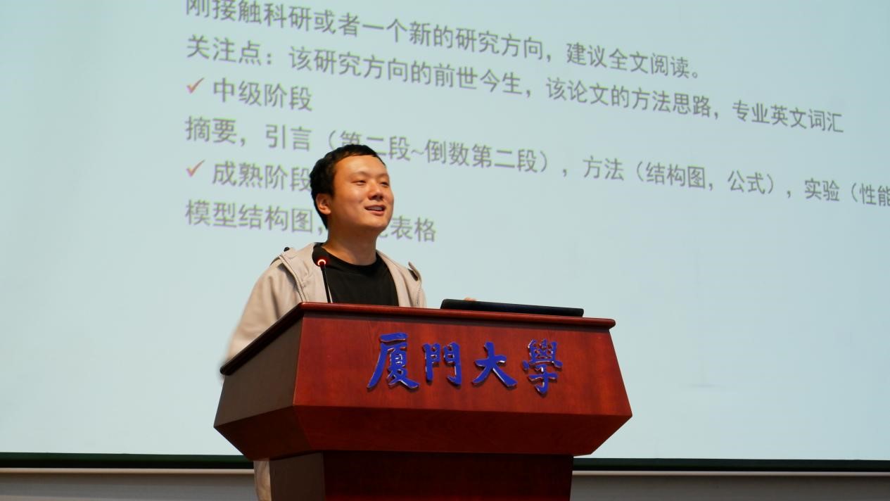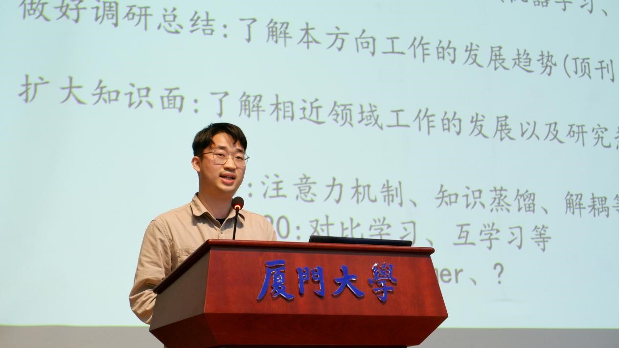 杨汶锦同学向大家分享了他的论文写作、竞赛准备以及实习经历,鼓励同学们要夯实基础、勇于尝试、善于总结和思考。同时,他认为做好时间规划安排很重要,并提示同学们用顶级会议的截稿日期来推动自己的进度。