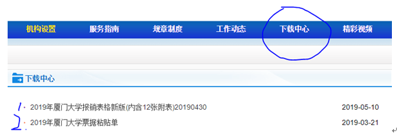 - 到学校财务处网站(https://cwc.xmu.edu.cn/ 右上方“下载中心”)下载并打印两类表格(下图所示文件1里附件excel的第一页“厦门大学经费报销单” 与文件2“厦门大学票据粘贴单”)(可多打印几份,以防出错)