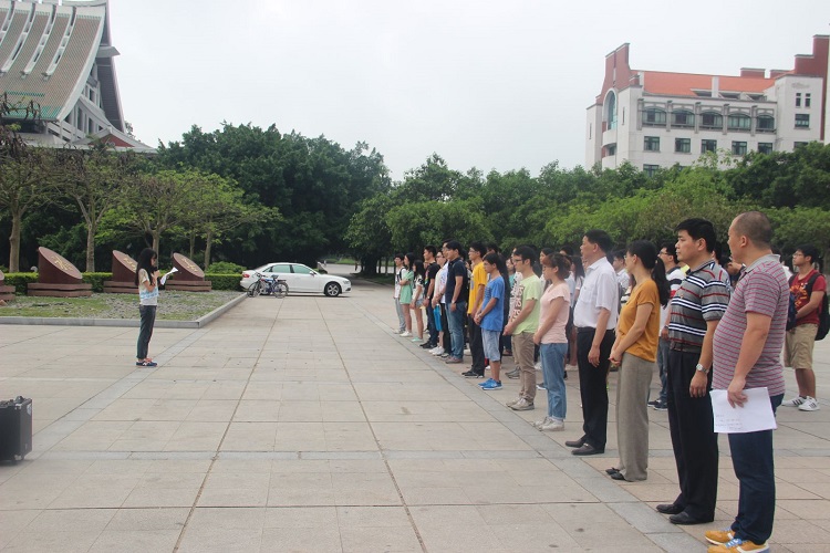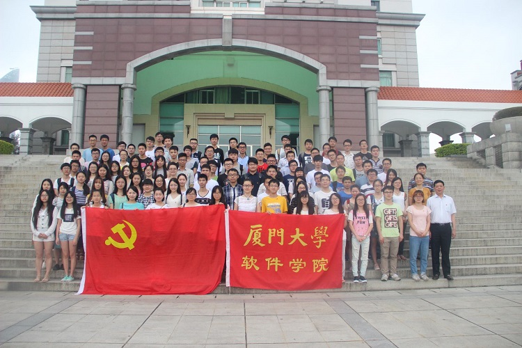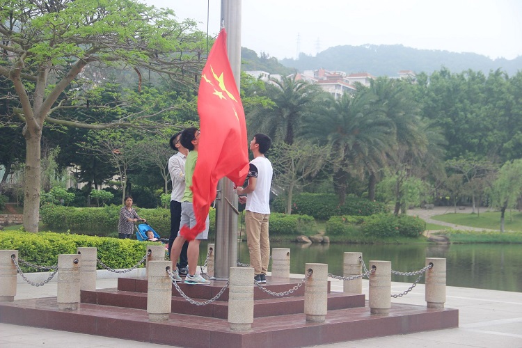 6点50分,佩戴着党徽,师生党员精神饱满,整齐列队。高超、朱展图和郑小平三位升旗手在国旗班吴锴同学的指导下整装待发。仪式开始,每位党员面向国旗行注目礼,并齐声高唱国歌。在雄壮的国歌声中,五星红旗冉冉升起,迎风招展。大家嘹亮的歌声在芙蓉湖面萦绕激荡。升旗礼毕,2012级本科生刘琪同学作为学生党员代表发言。首先她表达了对四年厦大时光的深深眷恋,并对四年的大学生党员生活做了提炼和总结,告诫低年级党员同学要铭记党员身份,主动发挥模范带头作用,不给自己留下遗憾,更为鲜红的党旗增光添彩。刘琪希望学弟学妹在大学期间应始终把学习放在首位,将充分的实践经验作为补充,真正的发挥党员先进性,让党员的光彩布满校园。